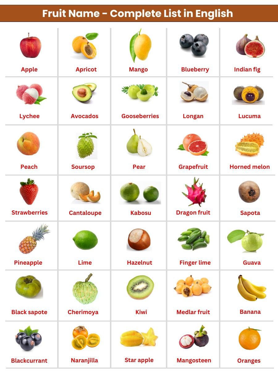 Fruits Name in English with Pictures, Charts & Amazing Health Benefits